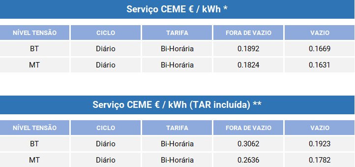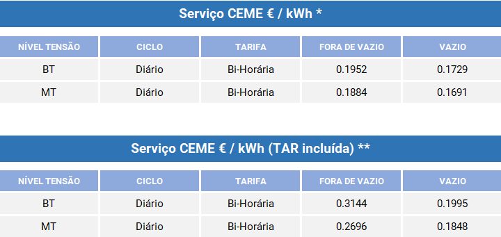 * Excluem-se aos valores acima indicados os custos correspondentes à Tarifa de Acesso a Redes (TAR), Tarifa de Operador de Postos de Carregamento (OPC), o custo do Imposto Especial de Consumo (IEC) a Tarifa da Entidade Gestora de Mobilidade Eléctrica (EGME) e o IVA.
